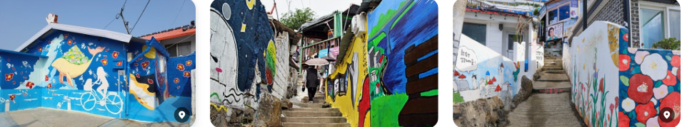 꿀팁 | 편한 신발은 필수! 언덕길이 많으므로 유모차보다는 아기 띠를 추천합니다. 아이들이 좋아할 만한 물고기, 히어로 캐릭터 벽화를 찾아보는 미션을 주면 더욱 즐거워합니다. |
