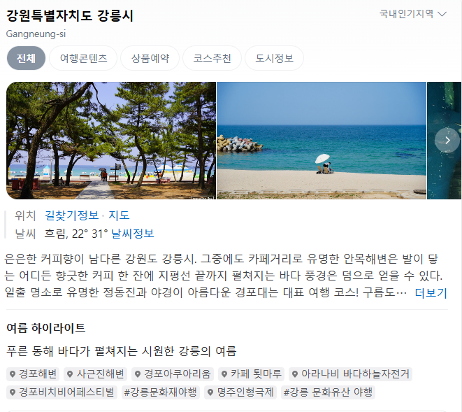 소개 | 강릉을 대표하는 해수욕장으로, 넓은 백사장과 울창한 소나무 숲이 어우러진 곳 |