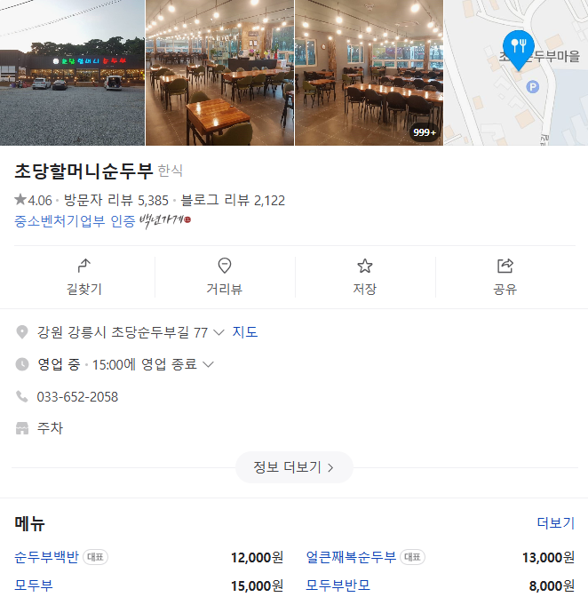 소개 | 강릉 초당두부마을의 원조 격 맛집. 담백한 순두부백반과 얼큰한 짬뽕순두부가 대표 메뉴. |